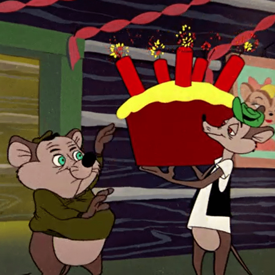 With Ned's help, Ralph gets the cupcake into the mousehole. But as they surprise Alice, Ned mistakenly puts dynamite (or tiny fireworks) on the cupcake as "candles".